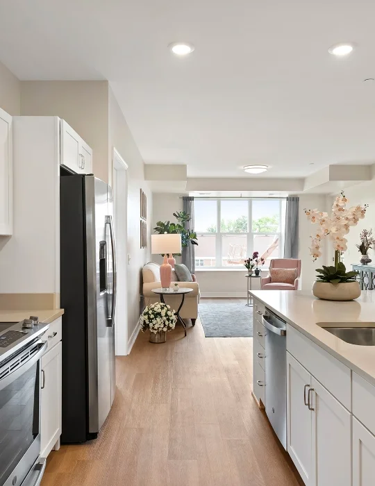Discover the One Bedroom Custom suite, which includes a private bathroom and pass-through closet. Plus, a generous living space flows into the kitchen.